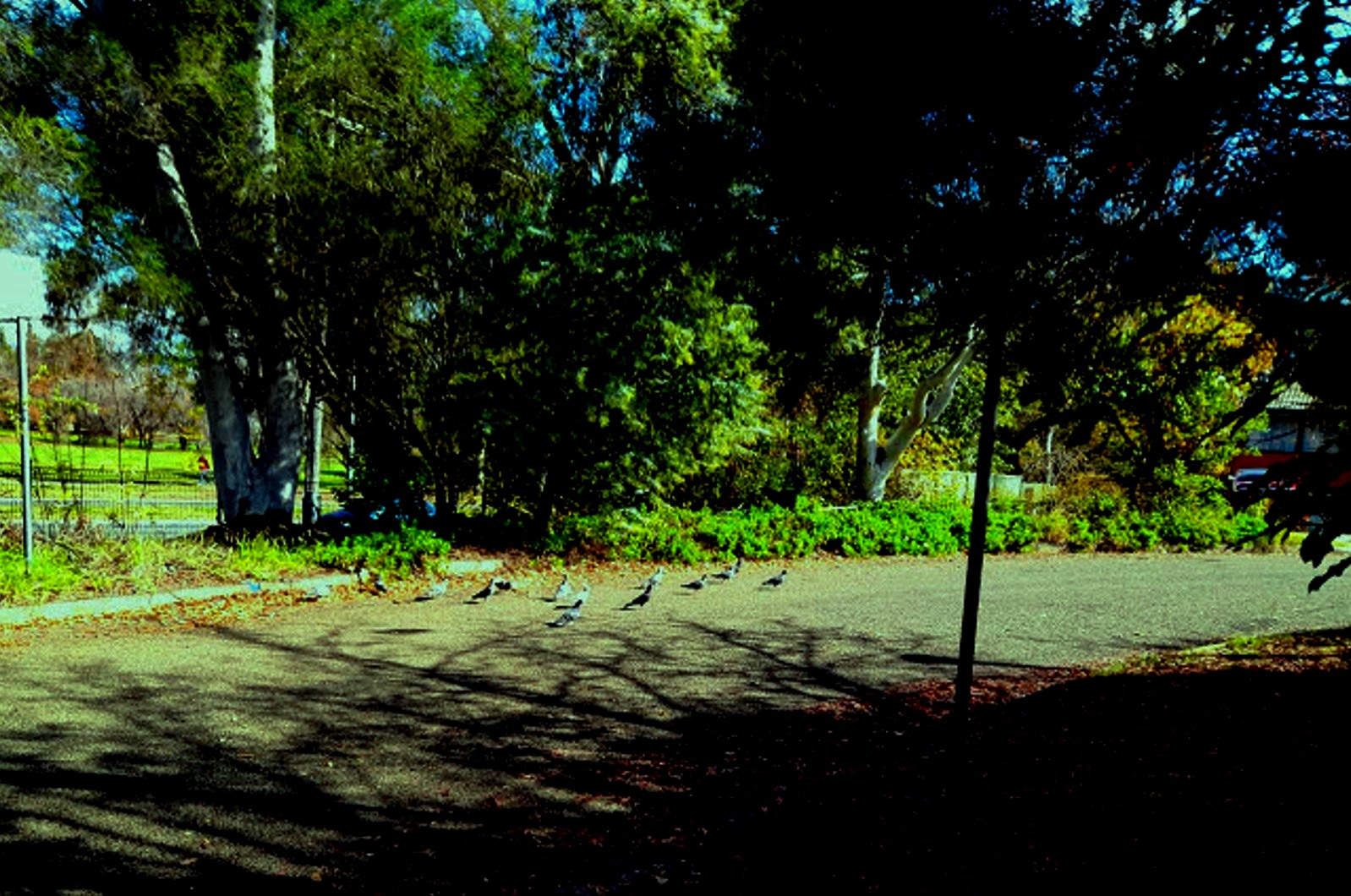 I was walking on my lawn when I saw a flock of pigeons. They were sitting on the street and probably finding something to eat.