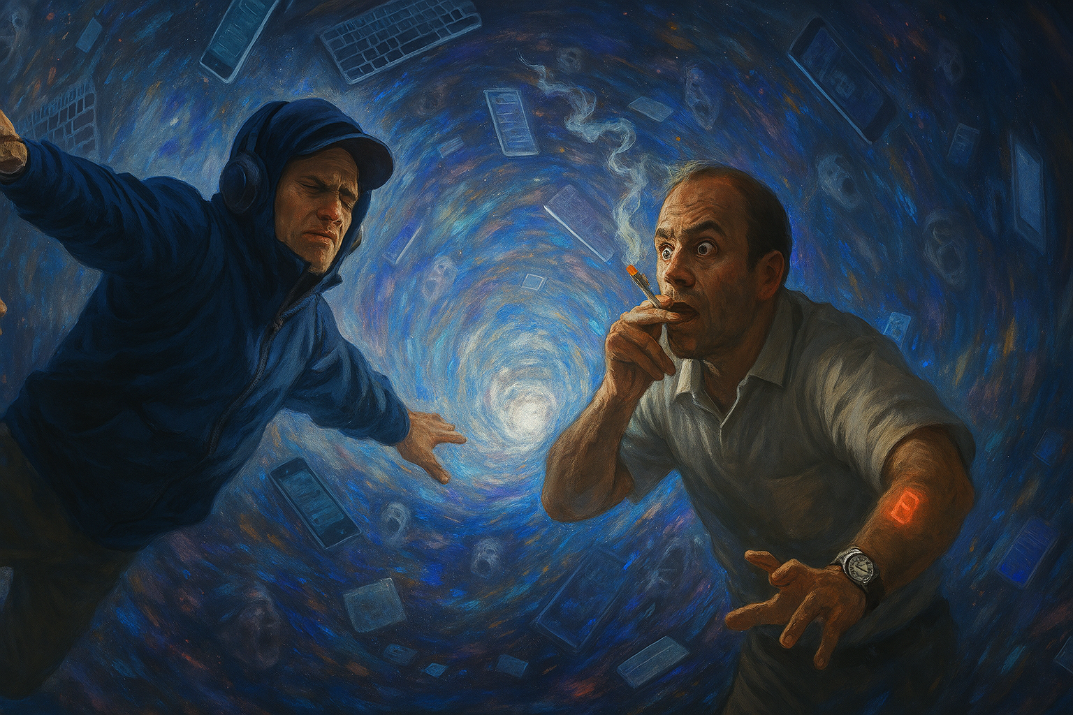 Pedro bent and shifted. The phone loaded. The world cracked. Both men woke. Lisbon sidewalk. Almaty café. Their devices chimed. The universe had taken their words.