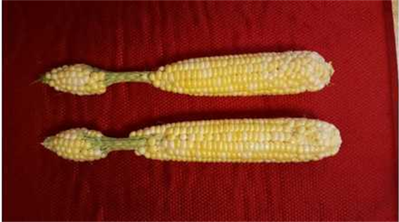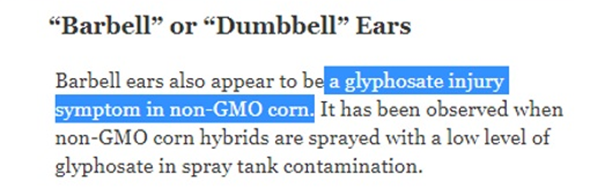 Another cause is due to glyphosate injury symptoms in non-GMO sweet corn because of spray tank contamination. So, the incidence of this ‘barbell’ corn is either one of the two causations or a combination of both.