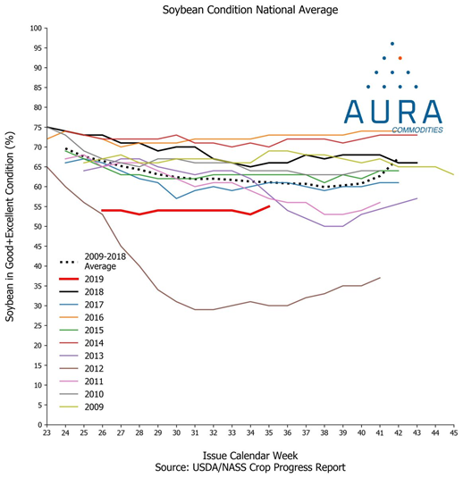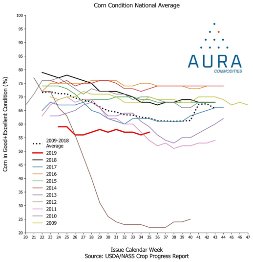 Looking at the Corn Condition National Average. The red solid line is where we are, 2019. That steep drop-off, which seems to be an outlier is in 2012 when massive floods, like the one we had occurred. It is then expected that we are going to experience lower yields in 2019 as well.