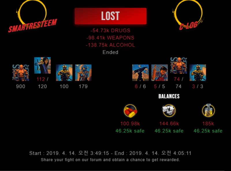 Check my latest fight ! smartresteem vs c-logc-log (43)in #drugwars-fight • 7 years ago #gaming #fight #dw