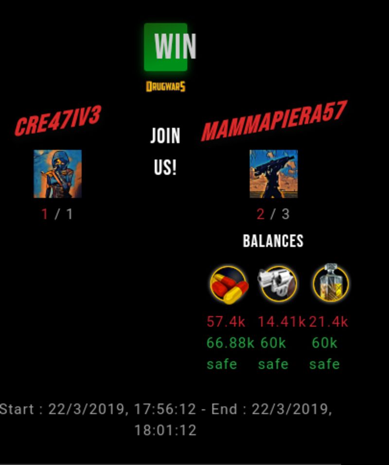 Check my latest fight ! cre47iv3 vs mammapiera57mammapiera57 (45)in #drugwars-fight • 7 years ago #gaming #fight #dw