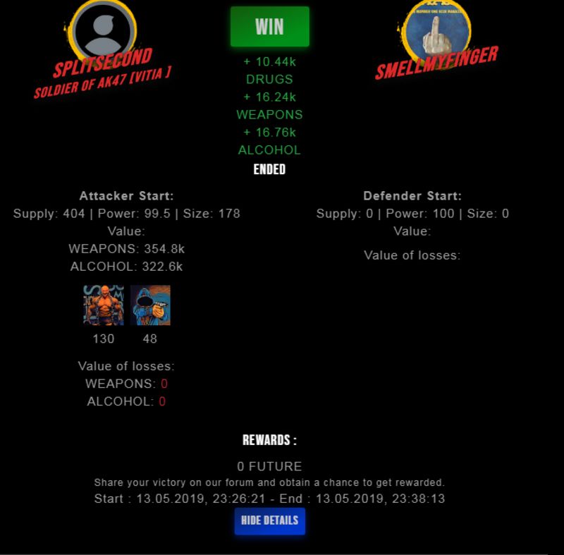 Congratulations @splitsecond ! Your fight received an upvote of 3% from the King Dealer as incentive for your activity and as a gratitude for your support to the game.