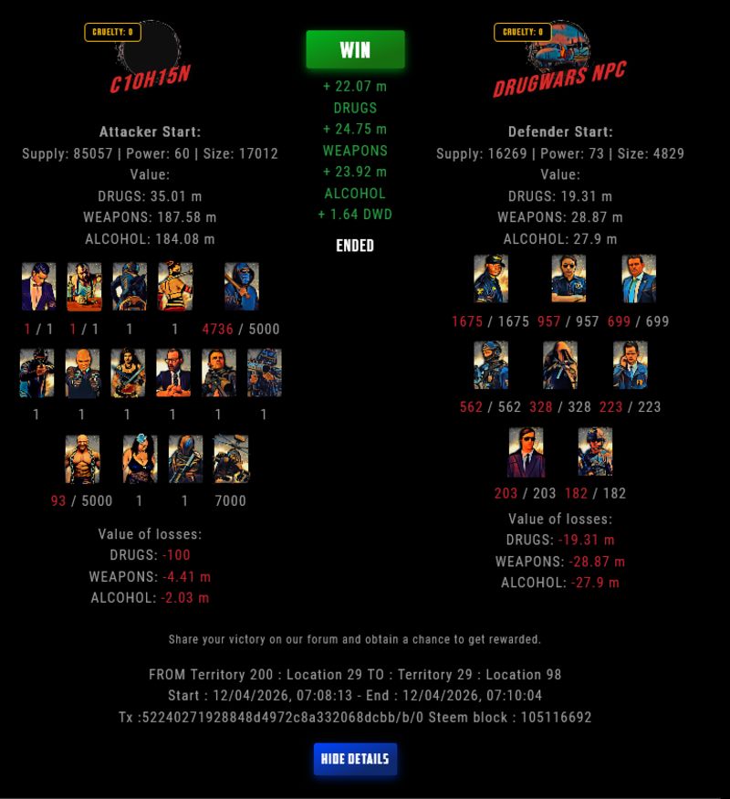 Check my latest fight ! c10h15n vs The Govermentblackwater-house (65)in DrugWars • 10 hours ago #drugwars-fight #gaming #fight #dw