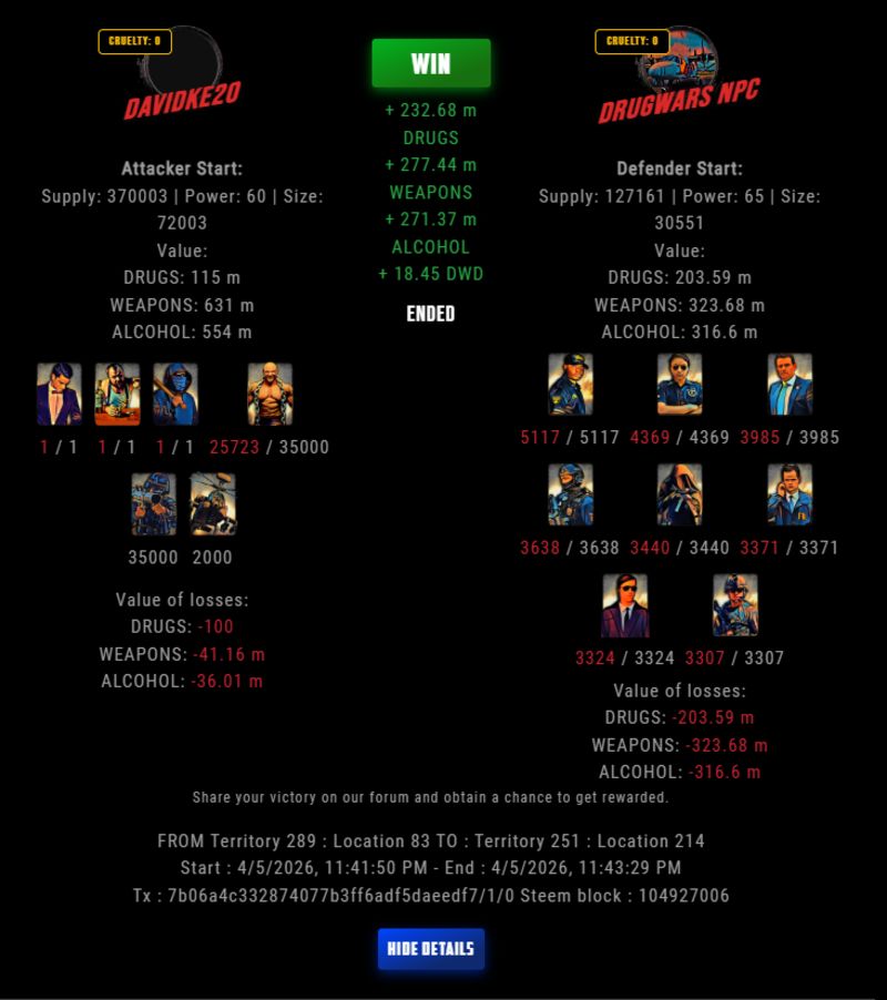Check my latest fight ! davidke20 vs The Govermentdavidke20 (74)in DrugWars • 3 hours ago #drugwars-fight #gaming #fight #dw