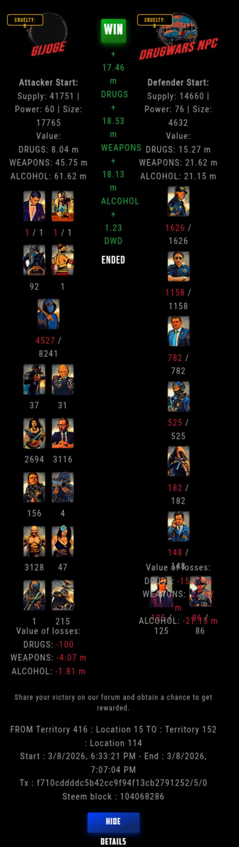 Check my latest fight ! gijoge vs The Govermentgijoge (59)in DrugWars • 20 hours ago #drugwars-fight #gaming #fight #dw