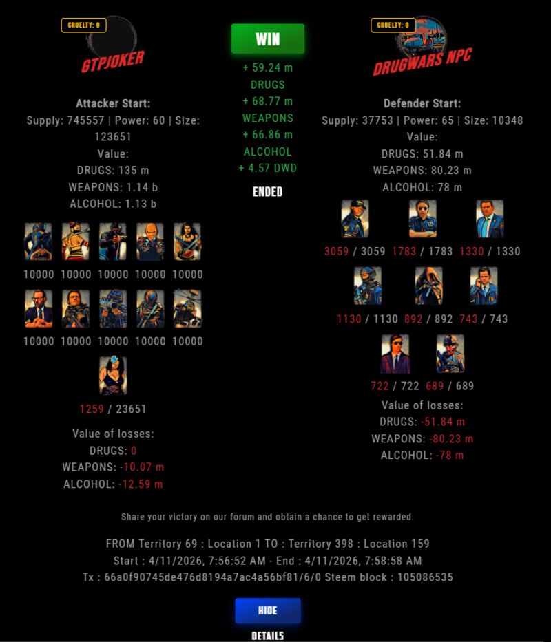 Check my latest fight ! gtpjoker vs The Govermentgtpjoker (61)in DrugWars • 11 hours ago #drugwars-fight #gaming #fight #dw