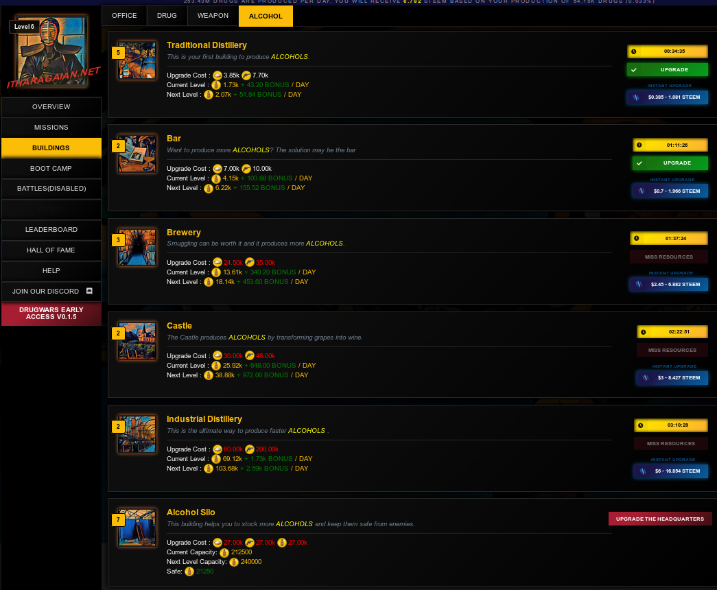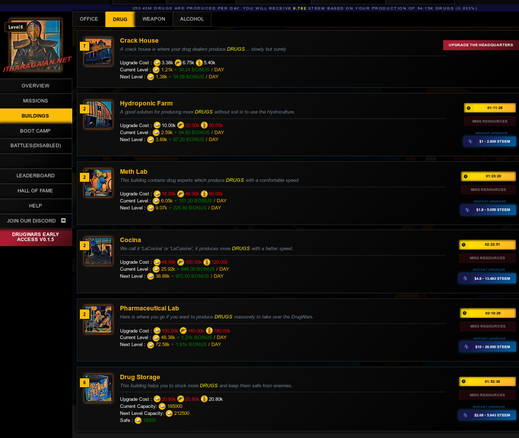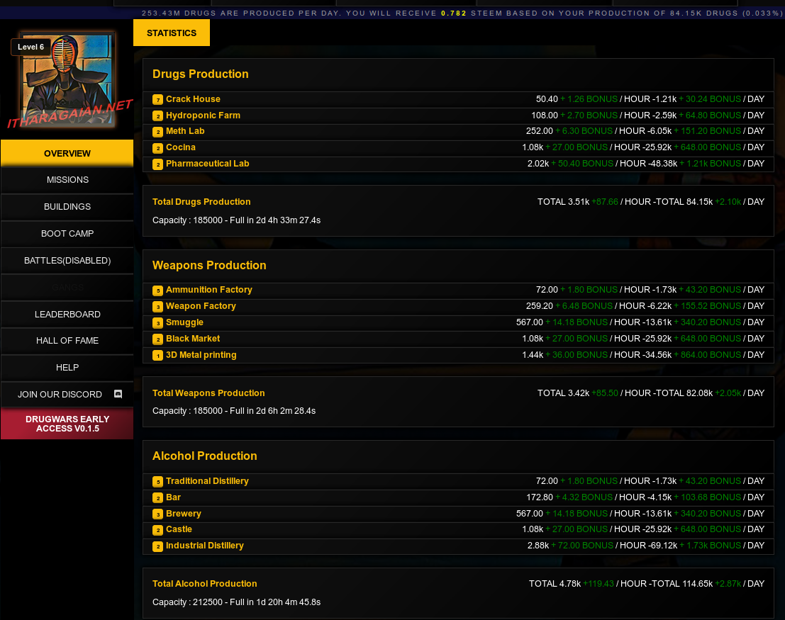 The more you produce daily, the more you receive as reward in steems, kindly offered by DRUGWARS.