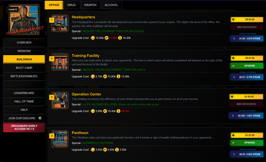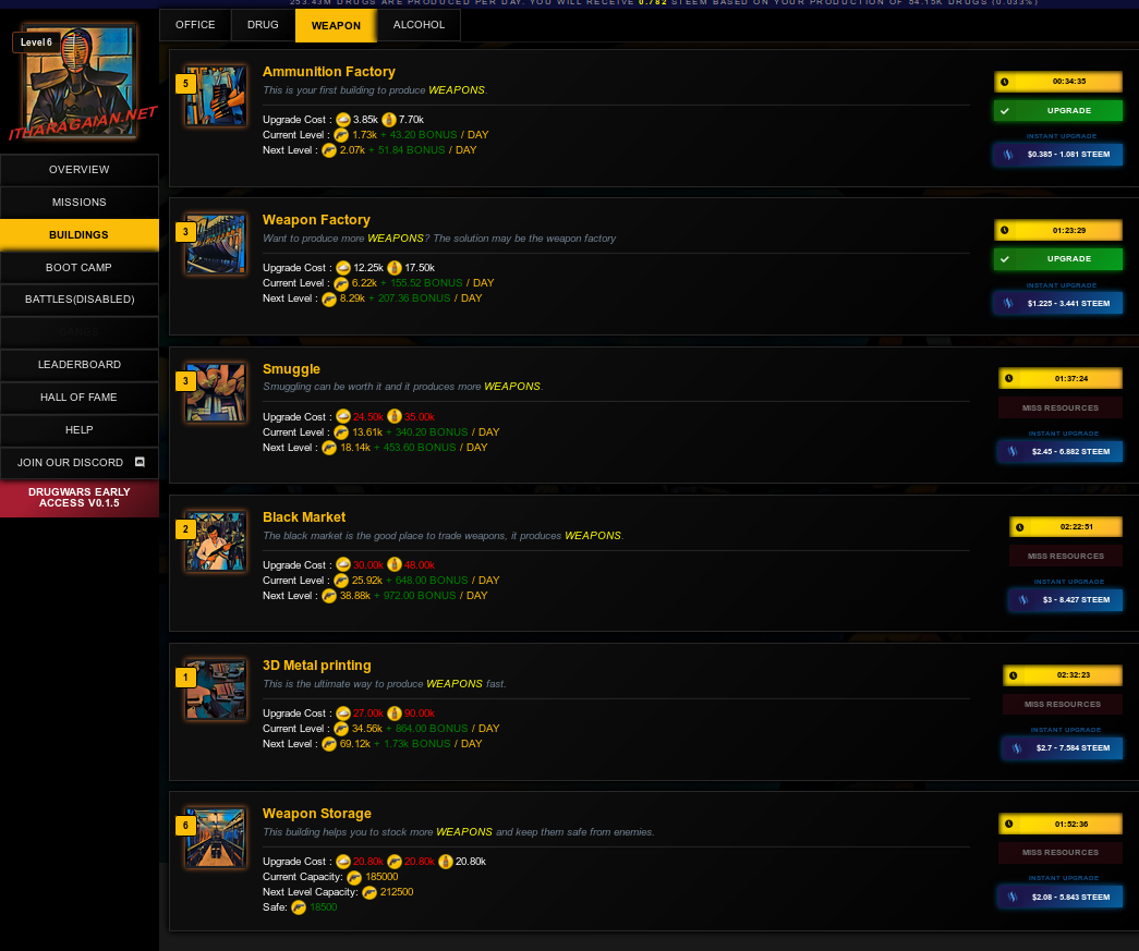 The goal here is to develop the biggest possilbe dealing empire, you are requested to produce as much drugs, weapons and alcohol to grow and become powerful.