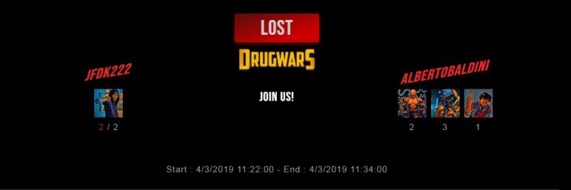 Check my latest fight ! jfdk222 vs albertobaldinijfdk222 (45)in #drugwars • 7 years ago #gaming #fight #dw