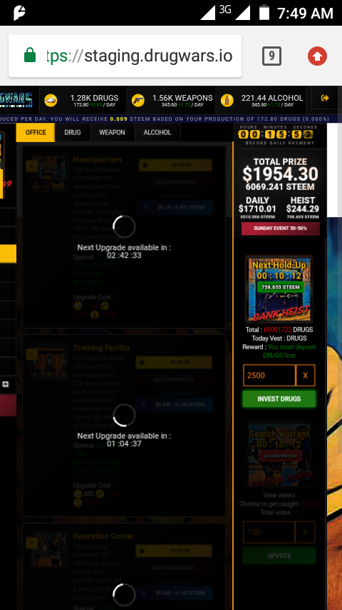 Secondly, notice that there is a "daily" and a "heist" payout. So everyday you will be paid for your portion of the total drugs produced by all users out of the daily payout. If you choose to "vest" your drugs, you will also be paid for those drugs on top of your daily payment. As you can see i have vested just over 133,000 drugs and will be paid almost 10 Steem for doing so. Or instead of vesting your drugs you can use them to buy upgrades to further your drug empire.
