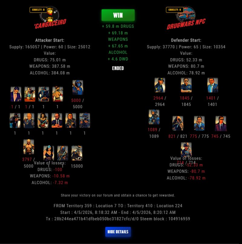 Check my latest fight ! 'cangaceiro vs The Govermentlastravage (67)in DrugWars • 10 hours ago #drugwars-fight #gaming #fight #dw