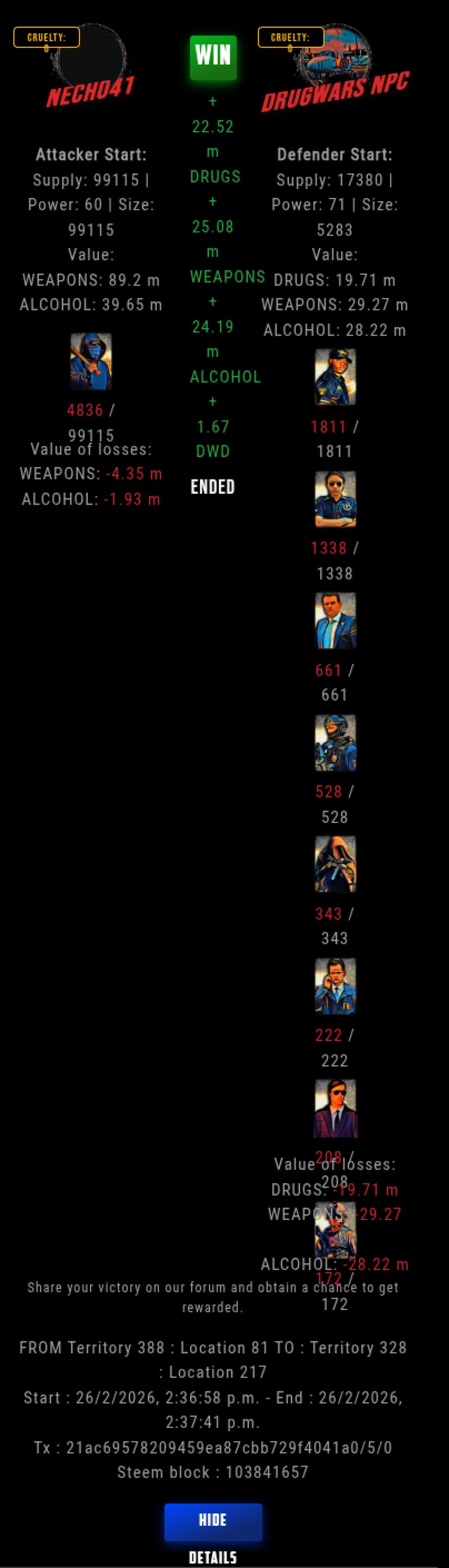 Check my latest fight ! necho41 vs The Govermentnecho41 (68)in DrugWars • 4 hours ago #drugwars-fight #gaming #fight #dw