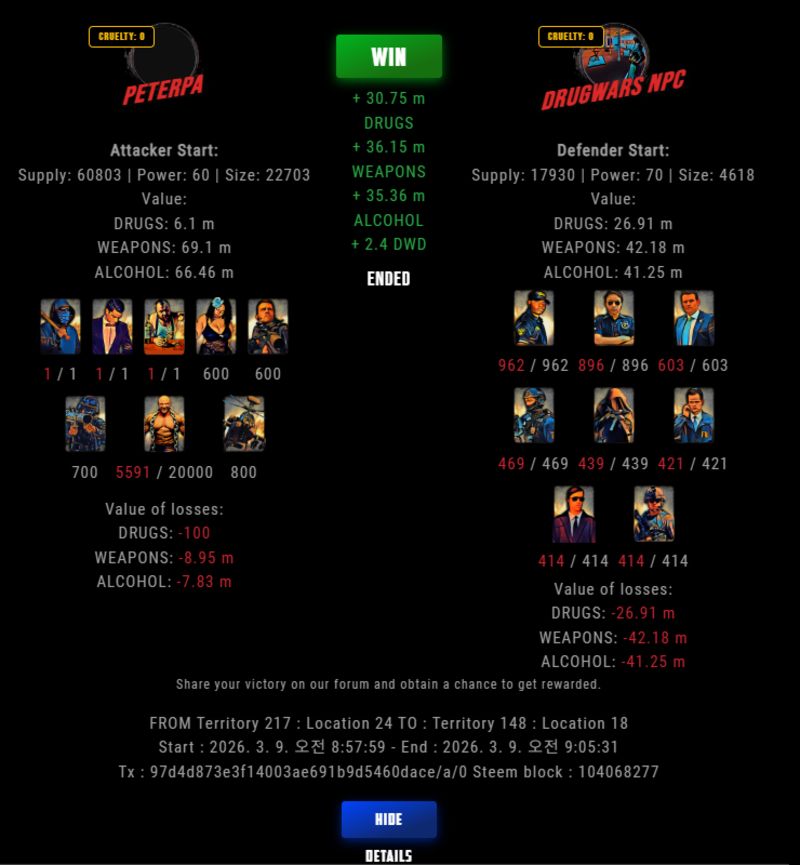 Check my latest fight ! peterpa vs The Govermentpeterpa (73)in DrugWars • 20 hours ago #drugwars-fight #gaming #fight #dw