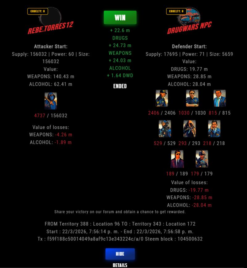 Check my latest fight ! rebe.torres12 vs The Govermentrebe.torres12 (66)in DrugWars • 9 hours ago #drugwars-fight #gaming #fight #dw
