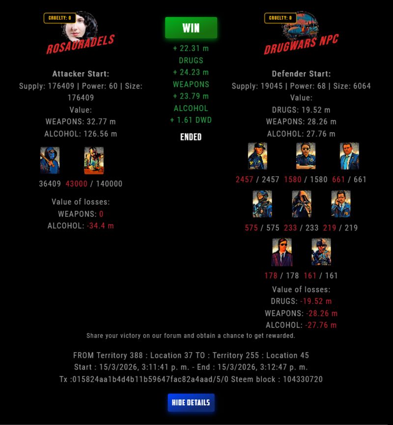Check my latest fight ! rosauradels vs The Govermentrosauradels (67)in DrugWars • 23 hours ago #drugwars-fight #gaming #fight #dw