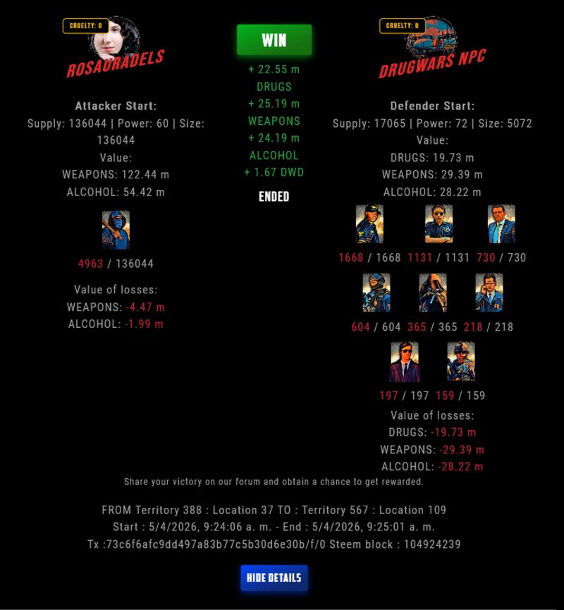Check my latest fight ! rosauradels vs The Govermentrosauradels (67)in DrugWars • 4 hours ago #drugwars-fight #gaming #fight #dw
