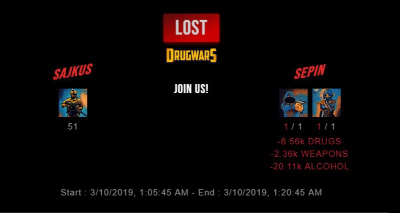 Congratulations @sepin ! Your fight received an upvote of 1% from the King Dealer as incentive for your activity and as a gratitude for your support to the game. Want to know more about DrugWars.io?