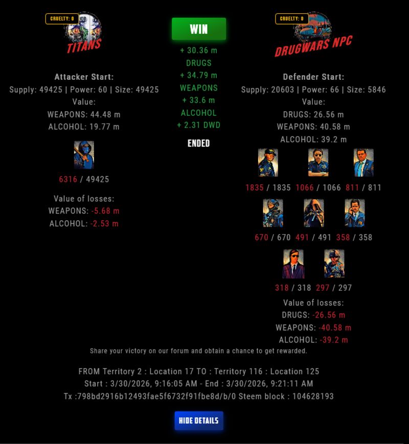 Check my latest fight ! titans vs The Govermenttitans (61)in DrugWars • yesterday #drugwars-fight #gaming #fight #dw
