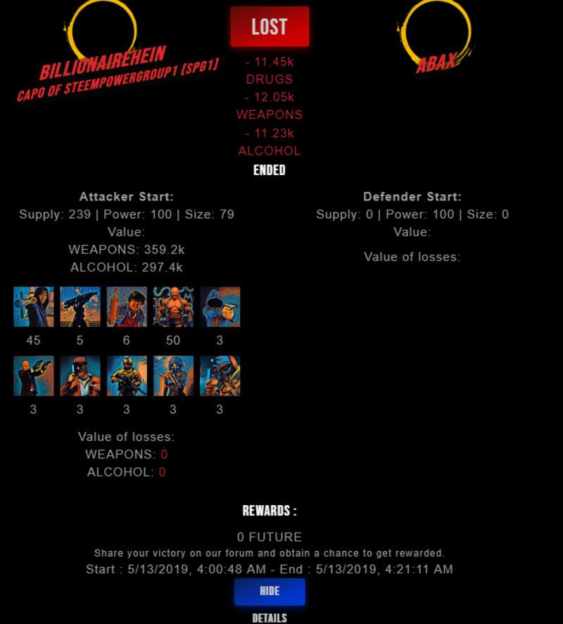 Congratulations @abax ! Your fight received an upvote of 2.3% from the King Dealer as incentive for your activity and as a gratitude for your support to the game.