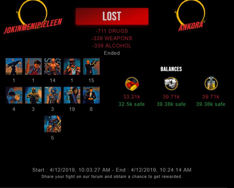 Check my latest fight ! jokinmenipieleen vs ankoraankora (25)in #drugwars-fight • 7 years ago #gaming #fight #dw