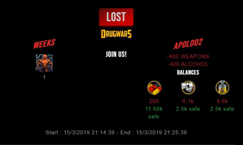Check my latest fight ! weeks vs apoloo2apoloo2 (46)in #drugwars-fight • 7 years ago #gaming #fight #dw
