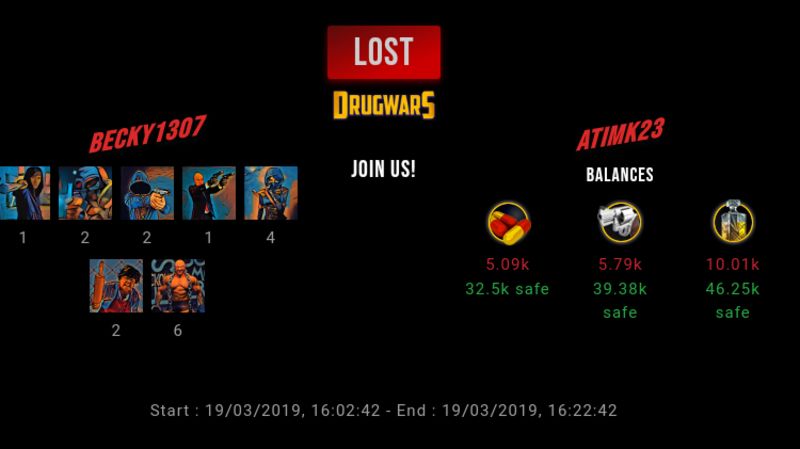 Check my latest fight ! becky1307 vs atimk23atimk23 (60)in #drugwars-fight • 7 years ago #gaming #fight #dw