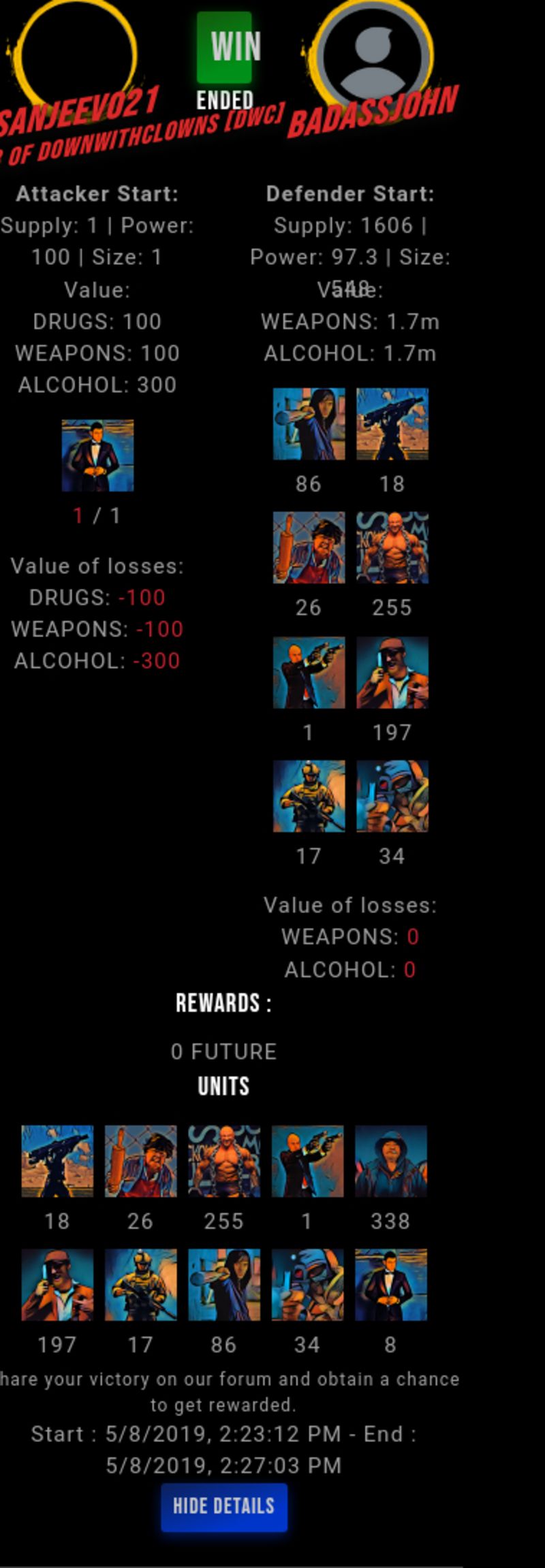 Check my latest fight ! sanjeevo21 vs badassjohnbadassjohn (60)in #drugwars-fight • 7 years ago #gaming #fight #dw