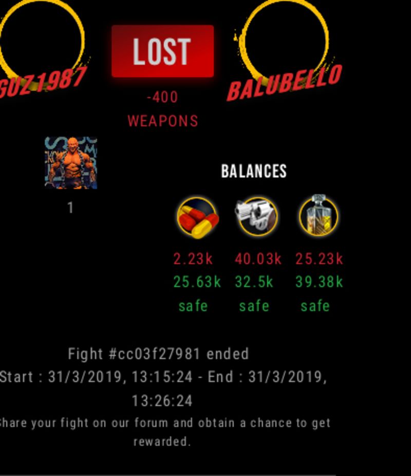 Check my latest fight ! guz1987 vs balubellobalubello (34)in #drugwars-fight • 7 years ago #gaming #fight #dw