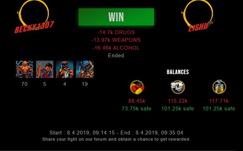 Check my latest fight ! becky1307 vs lishubecky1307 (47)in #drugwars-fight • 7 years ago #gaming #fight #dw