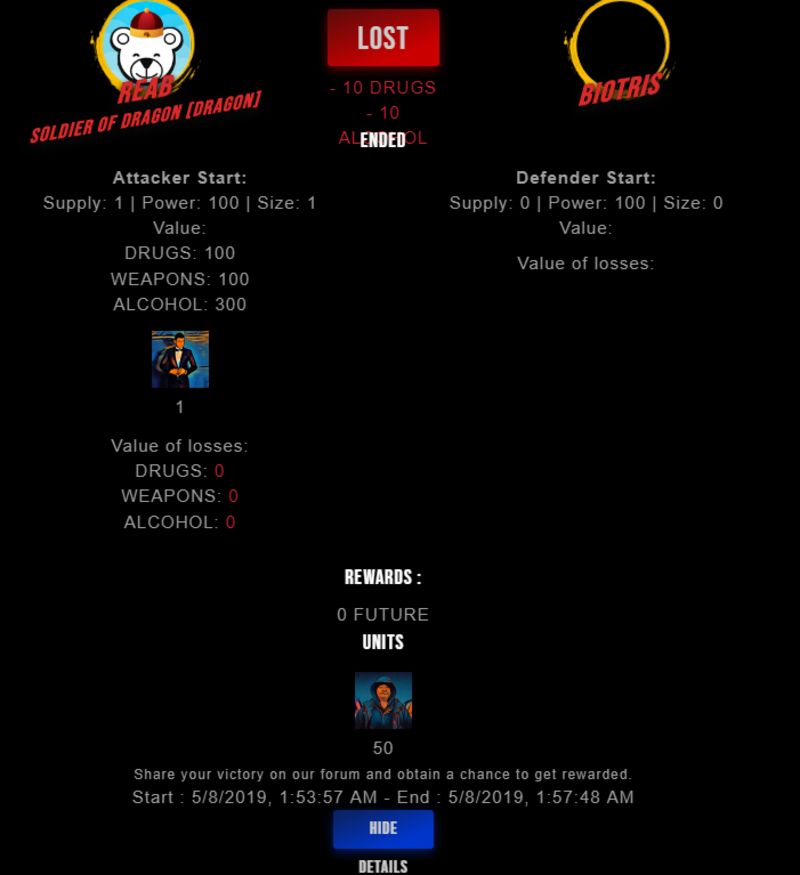 Congratulations @biotris ! Your fight received an upvote of 2% from the King Dealer as incentive for your activity and as a gratitude for your support to the game.