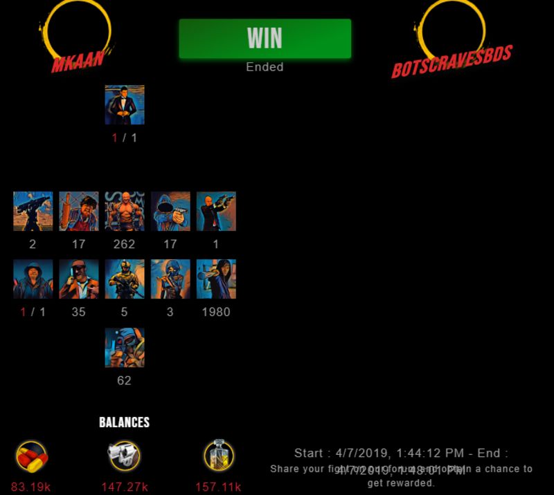 Check my latest fight ! mkaan vs botscravesbdsbotscravesbds (30)in #drugwars-fight • 7 years ago #gaming #fight #dw
