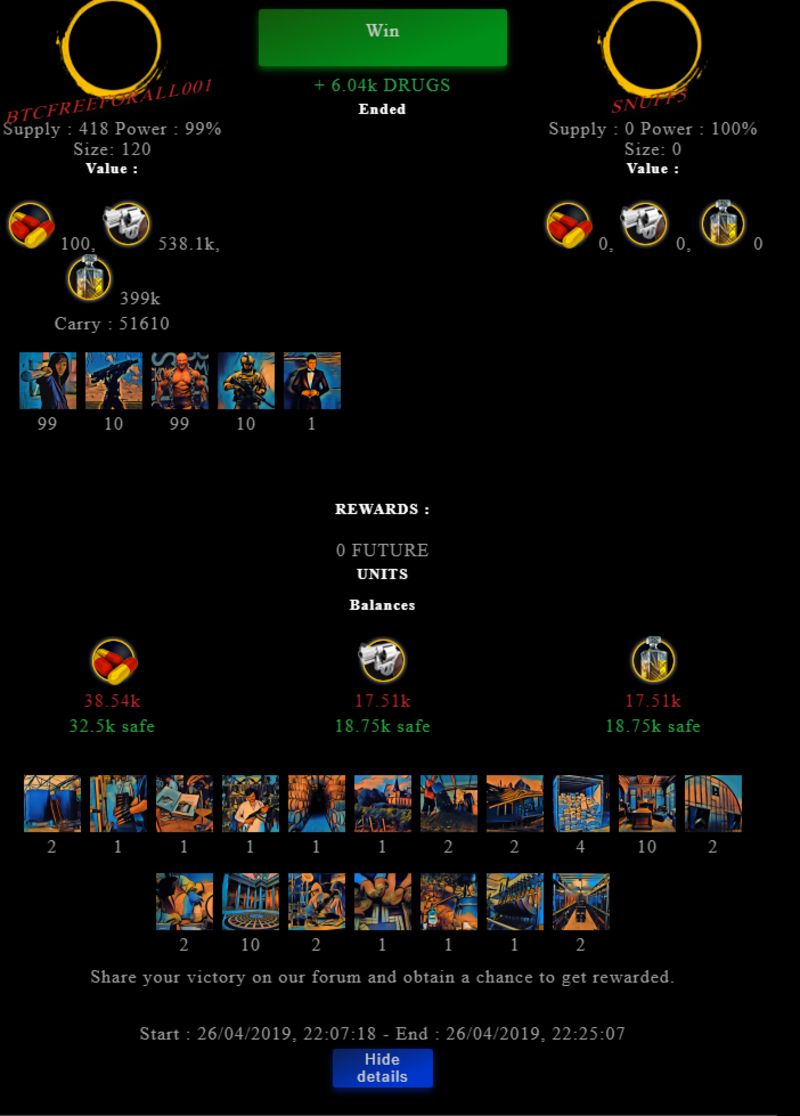 Check my latest fight ! btcfreeforall001 vs snuff5btcfreeforall001 (50)in #drugwars-fight • 7 years ago #gaming #fight #dw