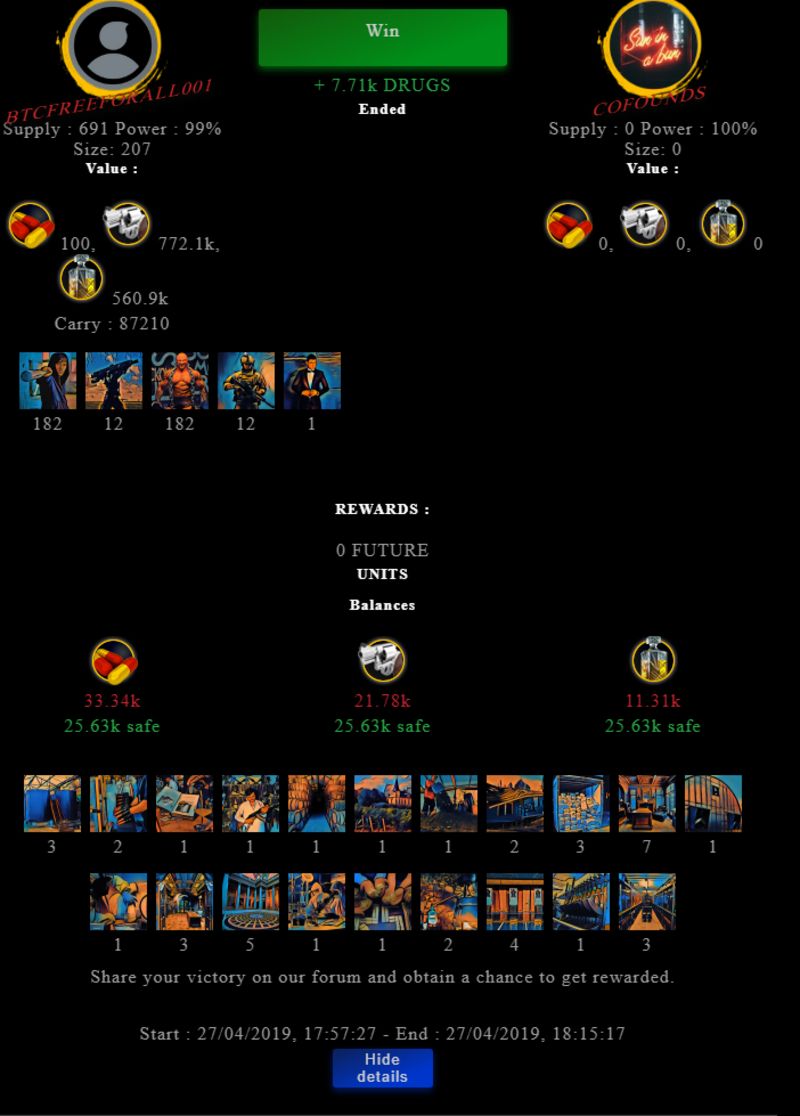 Check my latest fight ! btcfreeforall001 vs cofoundsbtcfreeforall001 (50)in #drugwars-fight • 7 years ago #gaming #fight #dw