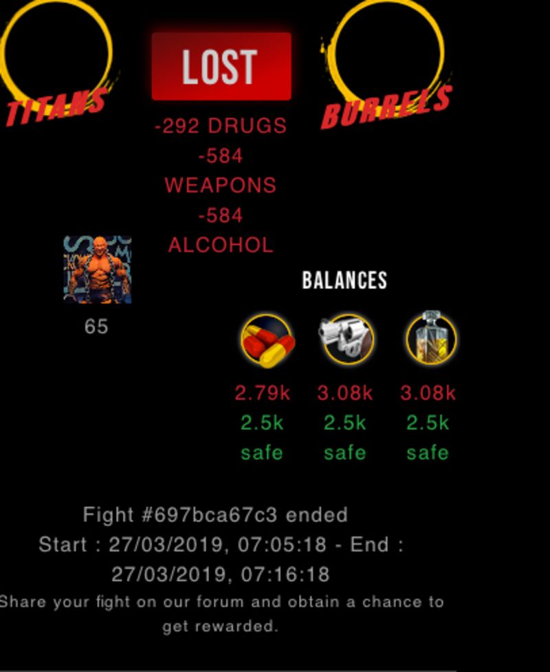 Check my latest fight ! titans vs burrelsburrels (51)in #drugwars-fight • 7 years ago #gaming #fight #dw