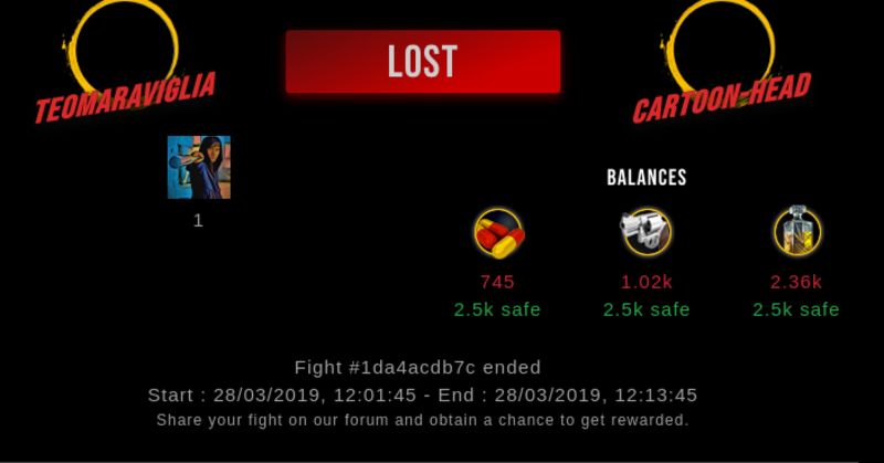 Check my latest fight ! teomaraviglia vs cartoon-headcartoon-head (59)in #drugwars-fight • 7 years ago #gaming #fight #dw