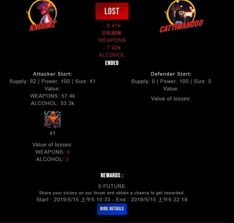 Check my latest fight ! kndrmz vs cattimandoocattimandoo (29)in #drugwars-fight • 7 years ago #gaming #fight #dw