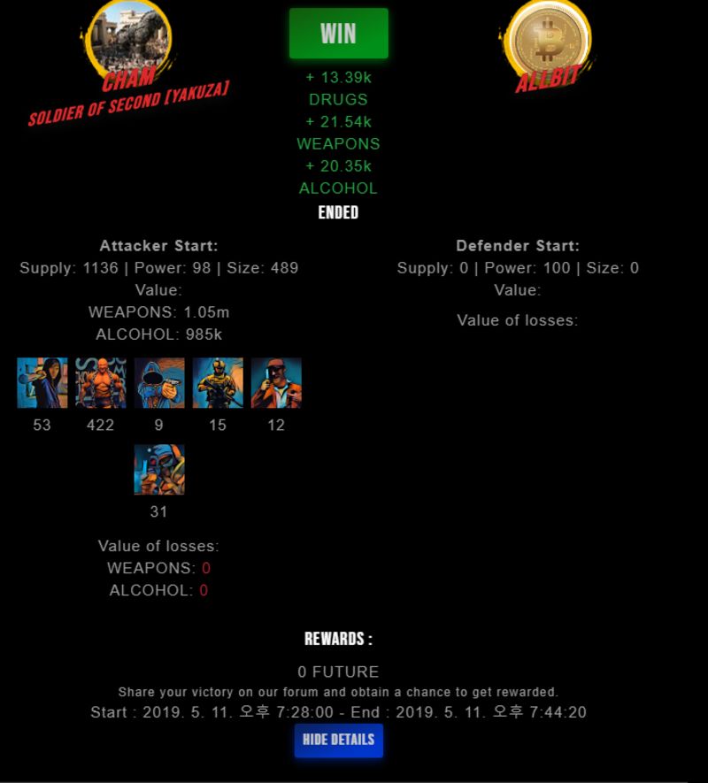Congratulations @cham ! Your fight received an upvote of 26% from the Dealer as incentive for your activity and as a gratitude for your support to the game. Want to know more about DrugWars.io?