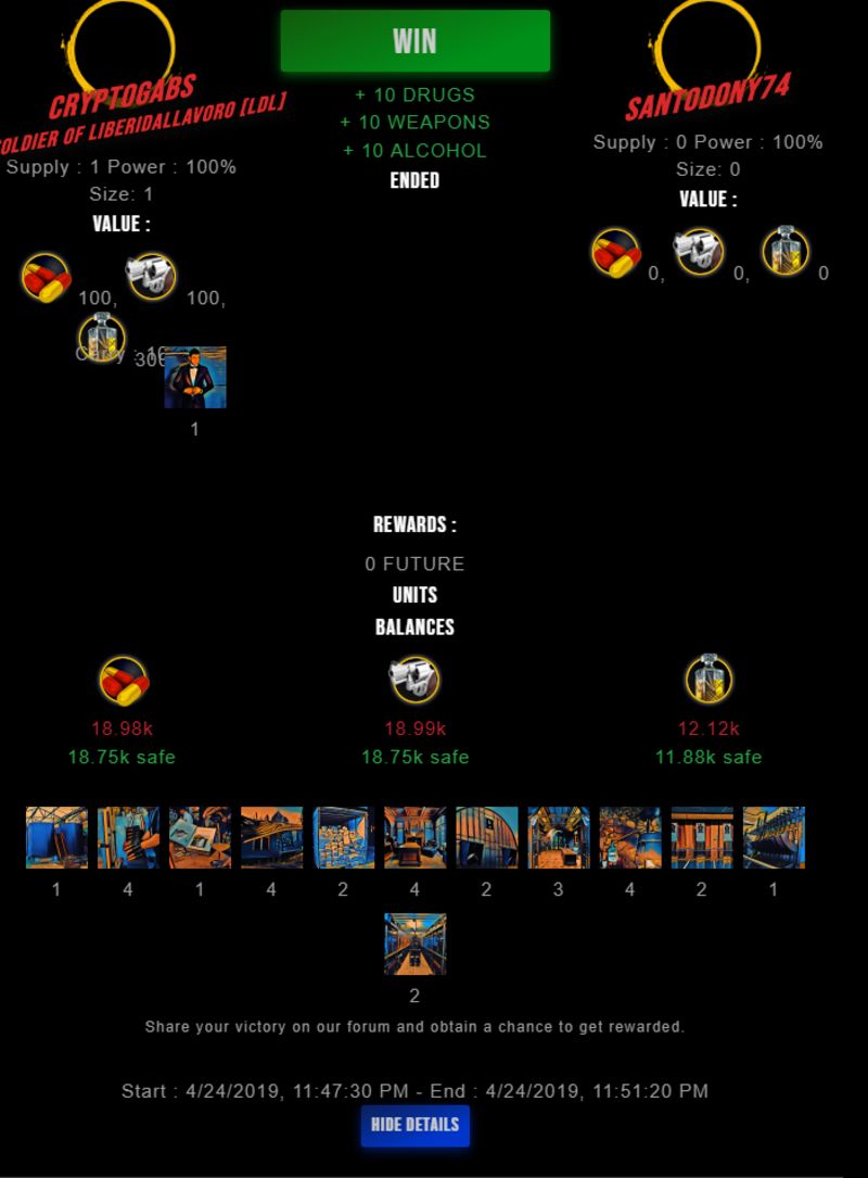 Check my latest fight ! cryptogabs vs santodony74cryptogabs (46)in #drugwars-fight • 7 years ago #gaming #fight #dw