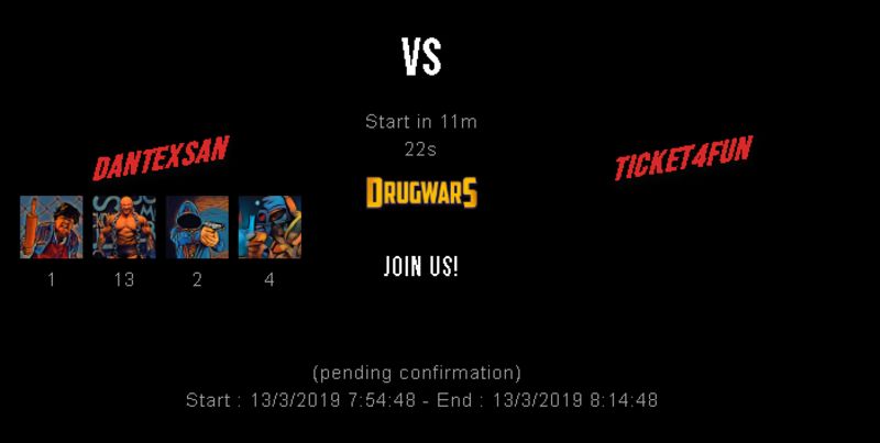 Check my latest fight ! dantexsan vs ticket4fundantexsan (36)in #drugwars-fight • 7 years ago #gaming #fight #dw