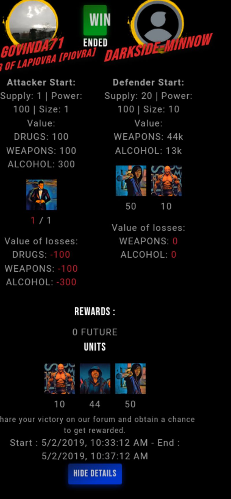 Check my latest fight ! govinda71 vs darkside-minnowdarkside-minnow (44)in #drugwars-fight • 7 years ago #gaming #fight #dw