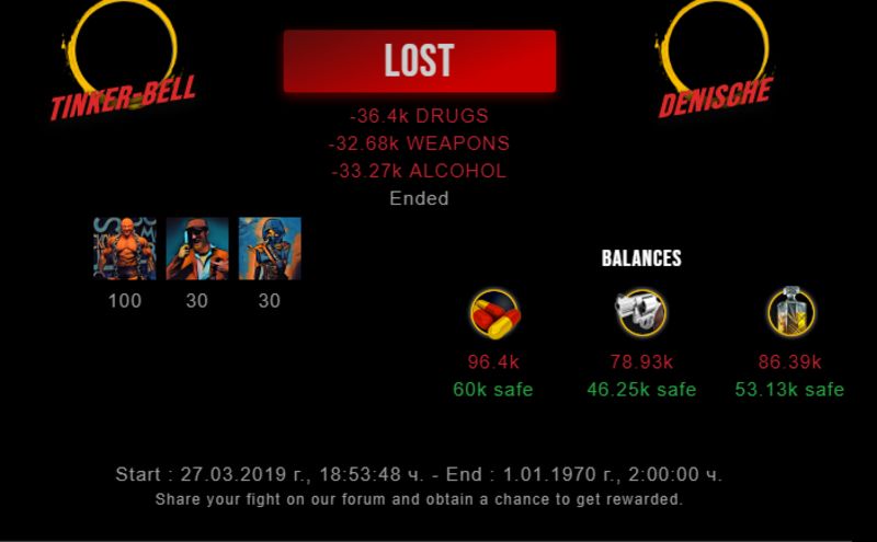 Congratulations @denische ! Your fight received an upvote of 1% from the King Dealer as incentive for your activity and as a gratitude for your support to the game.