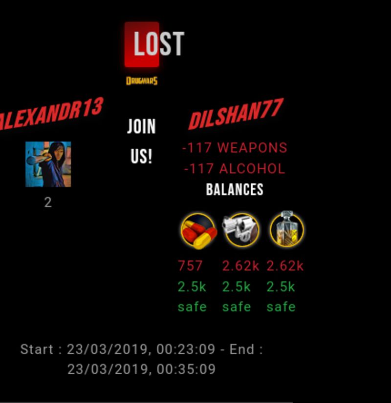 Check my latest fight ! alexandr13 vs dilshan77dilshan77 (1)(1)in #drugwars-fight • 7 years ago #gaming #fight #dw