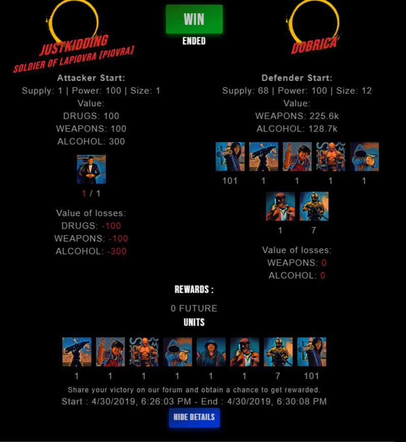 Check my latest fight ! justkidding vs dobricadobrica (61)in #drugwars-fight • 7 years ago #gaming #fight #dw