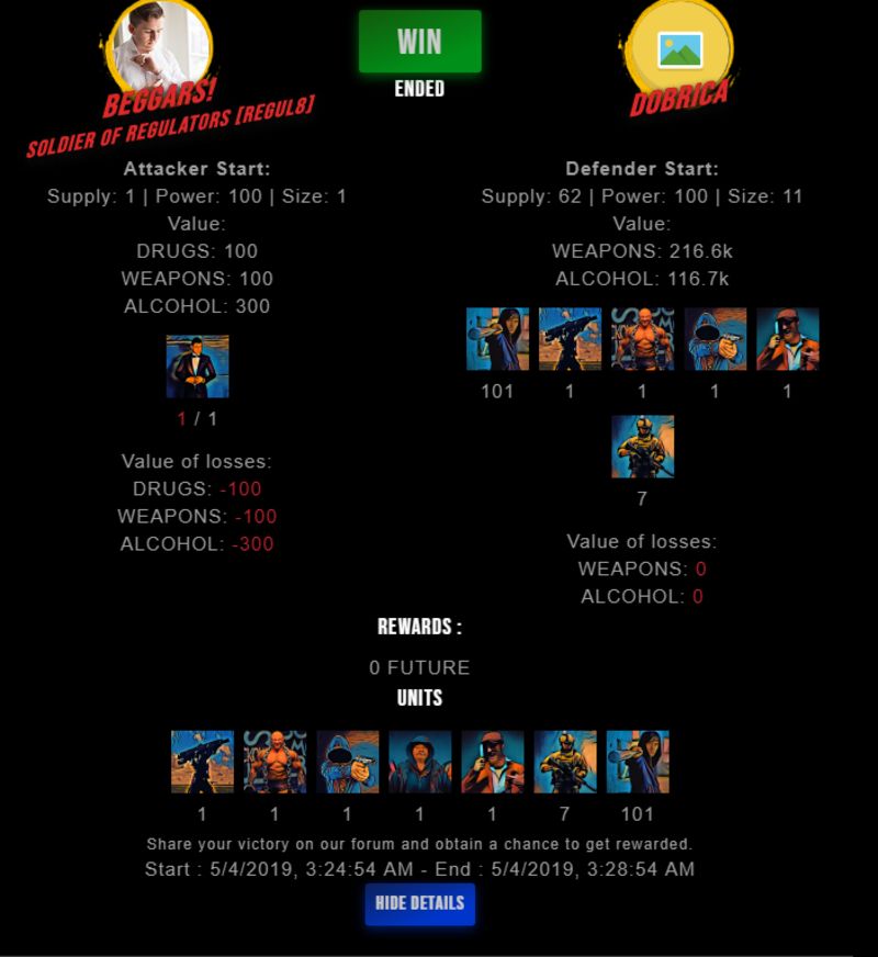 Check my latest fight ! beggars! vs dobricadobrica (61)in #drugwars-fight • 7 years ago #gaming #fight #dw