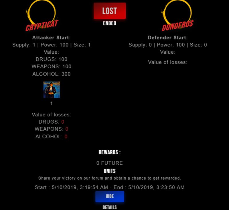 Congratulations @donofros ! Your fight received an upvote of 2% from the King Dealer as incentive for your activity and as a gratitude for your support to the game.