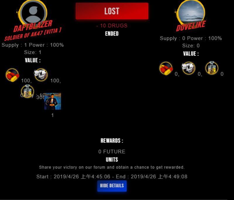Check my latest fight ! daftblazer vs dovelikedovelike (25)in #drugwars-fight • 7 years ago #gaming #fight #dw