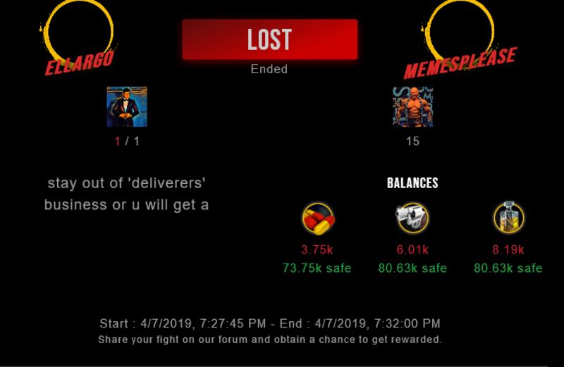Check my latest fight ! ellargo vs memespleaseellargo (30)in #drugwars-fight • 7 years ago #gaming #fight #dw