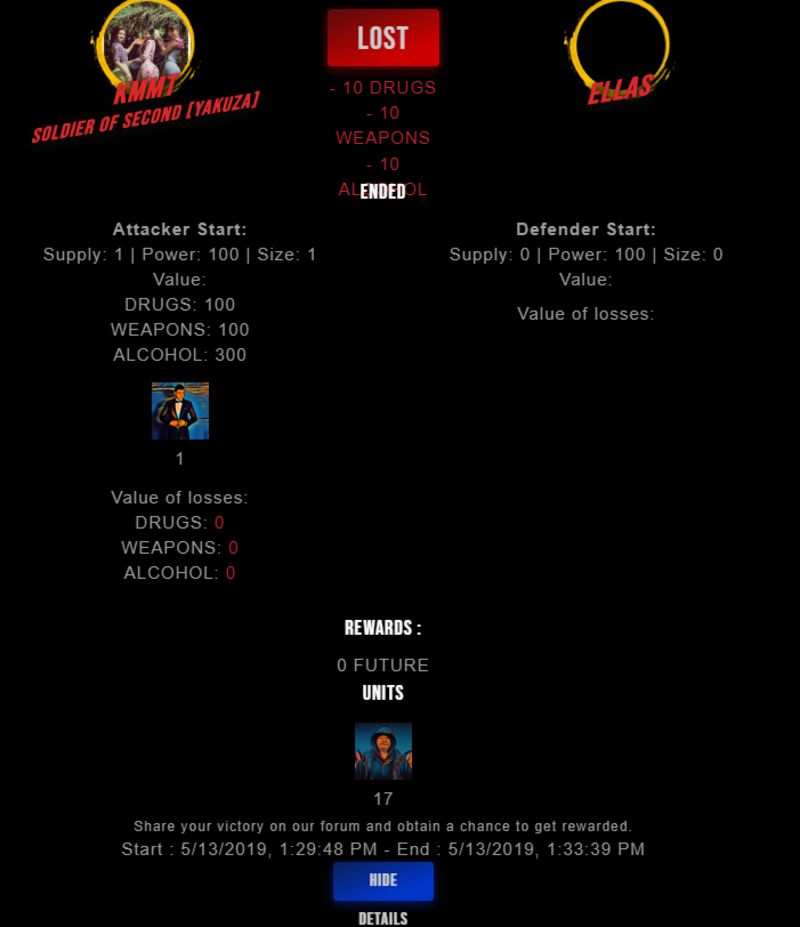 Congratulations @ellas ! Your fight received an upvote of 2.1% from the King Dealer as incentive for your activity and as a gratitude for your support to the game. Want to know more about DrugWars.io?