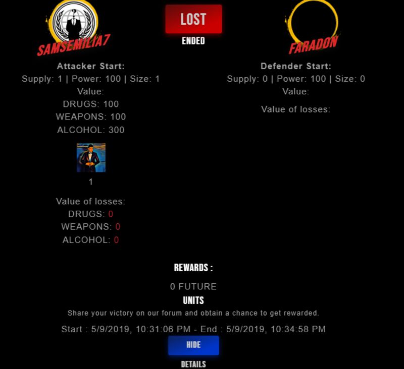 Congratulations @faradon ! Your fight received an upvote of 2% from the King Dealer as incentive for your activity and as a gratitude for your support to the game.